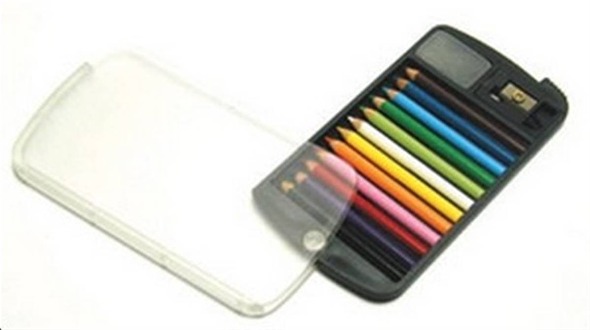 De la taille d'un téléphone portable, ce set comporte 12 mini crayons de couleur, ainsi qu'une gomme et un taille crayon adapté.